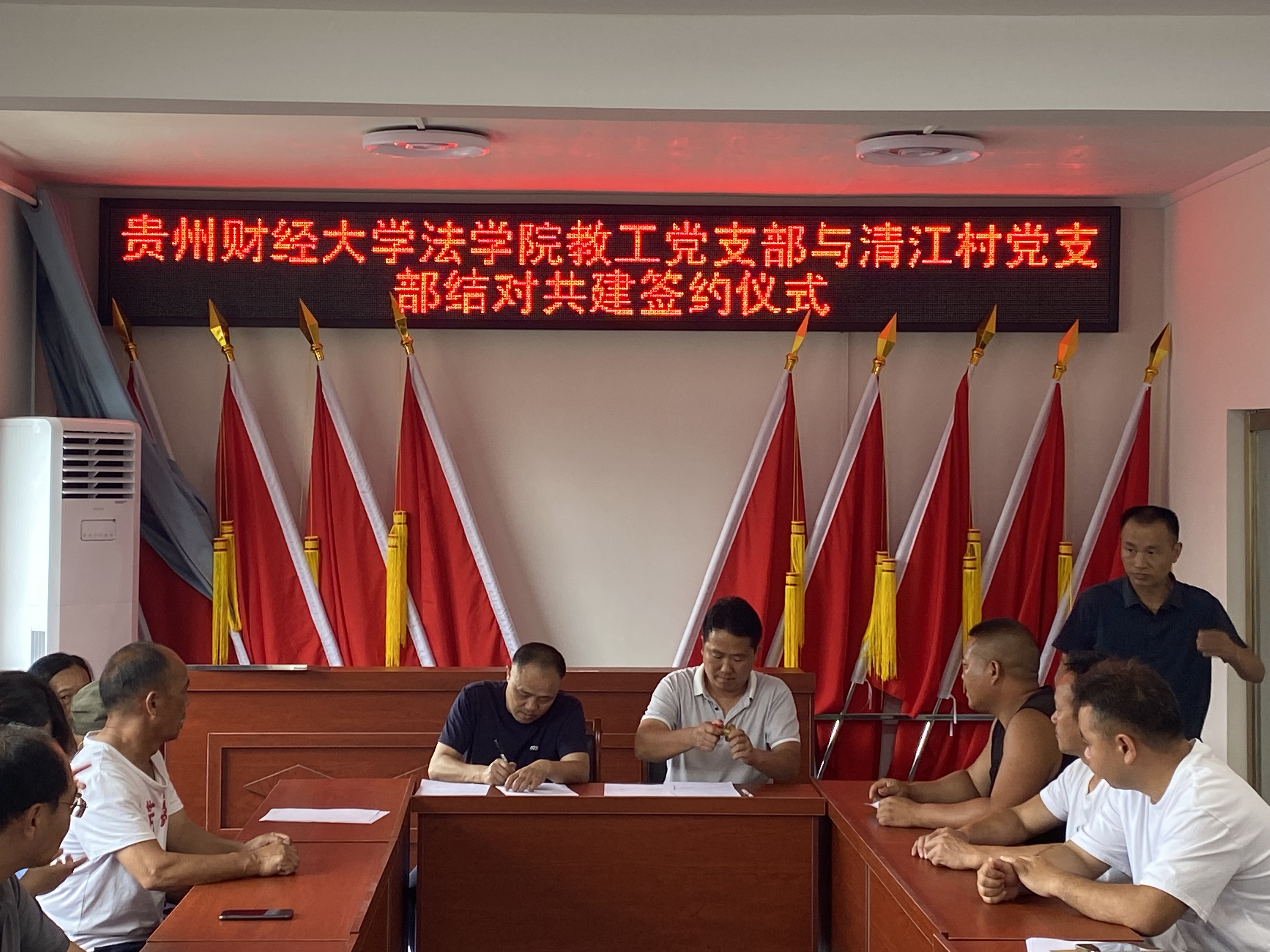 活动伊始,法学院党委与清江村村支两委、包括我院驻清江村第一书记李玉兰在内的驻村工作队开展座谈。清江村村支书陈世刚对法学院的到来表示欢迎,他介绍了清江村的村情民情等基本情况,希望法学院在民宿开发、苗族传统文化研学展销基地打造等方面给予支持。邵新顺表示将强化党建引领,与清江村党支部建立结对共建机制,发挥各自优势双向赋能,同时发挥法学院智力优势,为清江村的乡村振兴工作提供新思路、新方法。随后邵新顺与陈世刚共同为球赛qiusai(中国)党员法律志愿服务站挂牌。曹务坤和陈世刚则围绕村民比较关心的婚姻家庭问题开展了题为《守护家庭权益 助力乡村振兴》的理论宣传二人讲,并现场回答了村民的相关困惑。曹务坤作为法学院教工第二党支部书记与陈世刚签署了党支部结对共建协议,两个支部将在支部建设、产业发展、法律援助与调解等方面开展合作。