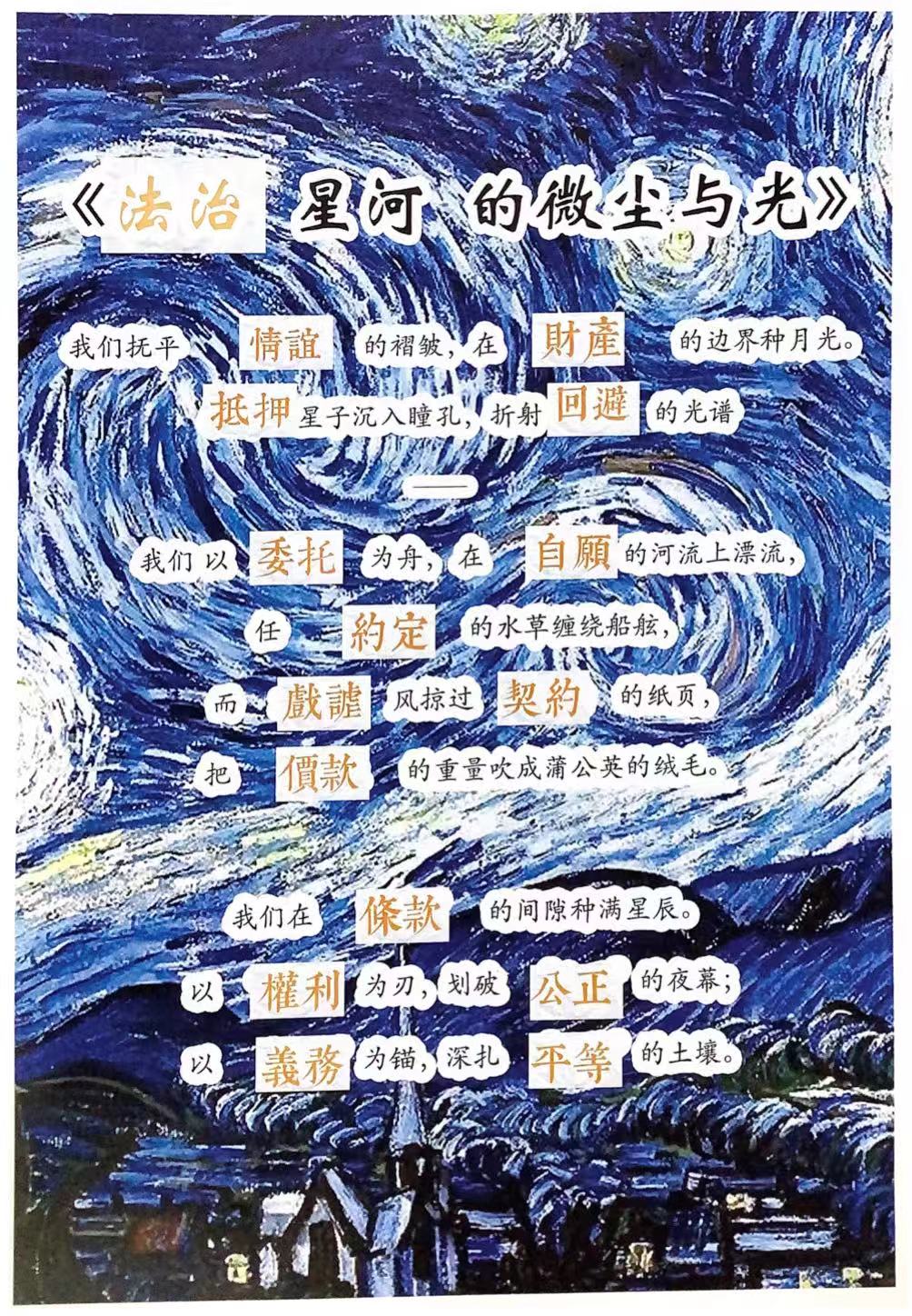 在比赛筹备阶段,法学院通过多种渠道广泛宣传,鼓励学生突破常规思维,以全新视角解读法律。同学们积极响应,充分发挥创意,从浩如烟海的法律法规中挑选出心仪的条文,精心构思,巧妙组合,创作出一首首别具一格的 “法条拼贴诗”。这些作品不仅展现了参赛者扎实的法律知识功底,更彰显了他们丰富的想象力和文学素养。有的作品以幽默诙谐的语言对常见法律场景进行描绘,有的则以深情庄重的笔触阐释法律的价值与意义,还有的通过巧妙的韵律和节奏让法条读起来朗朗上口。